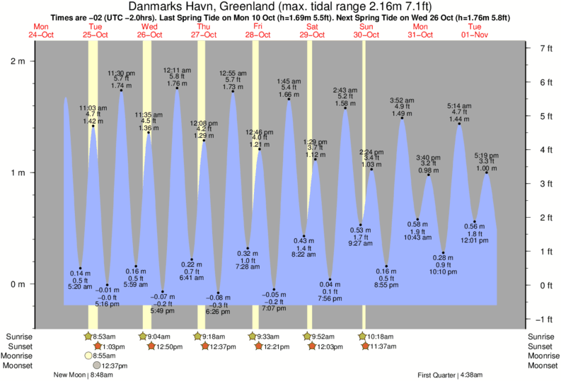 Tide Times are -03 (UTC -3.0hrs). Last Spring High Tide at Danmarks Havn was on Fri 05 Dec (height: 1.97m 6.5ft). Next high Spring Tide at Danmarks Havn will be on Sat 20 Dec (height: 1.71m 5.6ft).