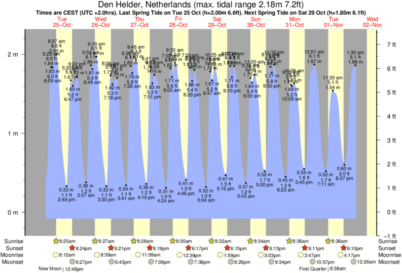 December and January Tide charts for Den Helder: The tide charts below show the height, time and date of high and low tides for the next 30 days.