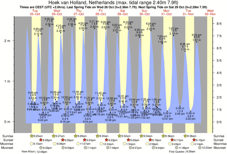 Hoek Van Holland tide chart key: The tide chart above shows the height and times of high tide and low tide for Hoek van Holland, Netherlands. The grey shading corresponds to nighttime hours between sunset and sunrise at Hoek Van Holland.
