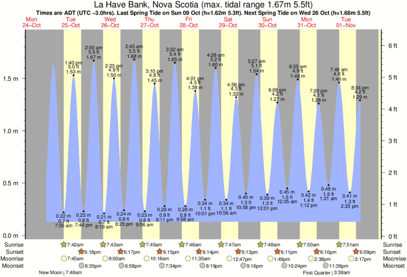 Tide Times are AST (UTC -4.0hrs). Last Spring High Tide at La Have Bank was on Thu 04 Dec (height: 1.79m 5.9ft). Next high Spring Tide at La Have Bank will be on Sat 20 Dec (height: 1.54m 5.1ft).
