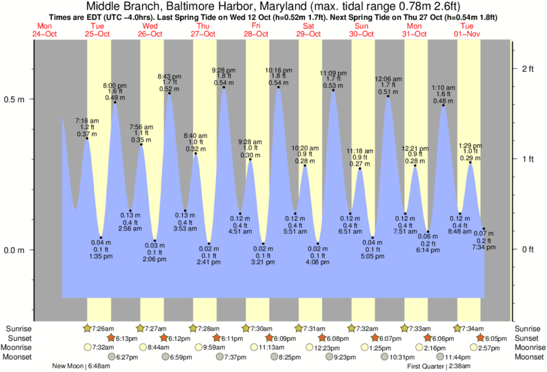 Tide Times are EST (UTC -5.0hrs). Last Spring High Tide at Middle Branch, Baltimore Harbor was on Thu 18 Dec (height: 0.36m 1.2ft). Next high Spring Tide at Middle Branch, Baltimore Harbor will be on Thu 01 Jan (height: 0.41m 1.3ft).