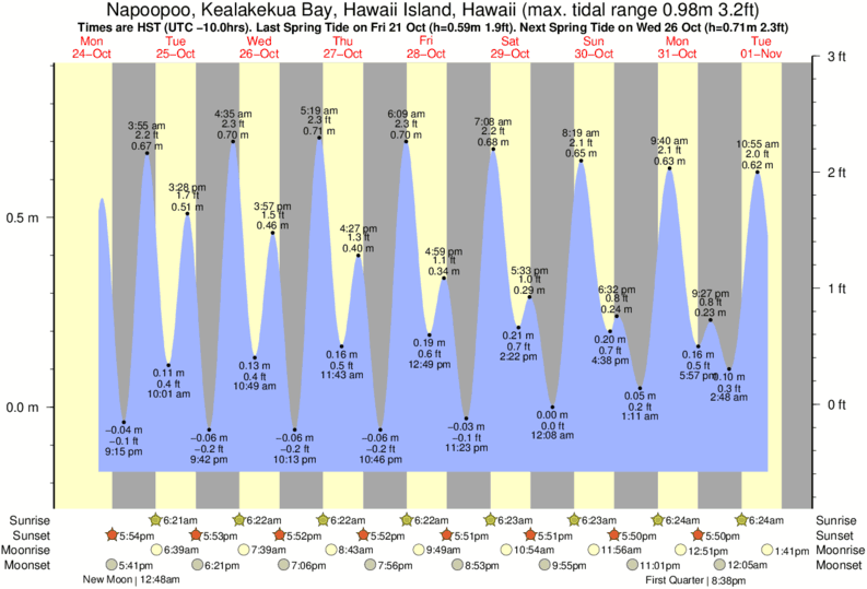 Tide chart for Napoopoo, Kealakekua Bay IslandShowing low and high tide times for the next 30 days at Napoopoo, Kealakekua Bay Island. Tide Times are HST (UTC -10.0hrs).