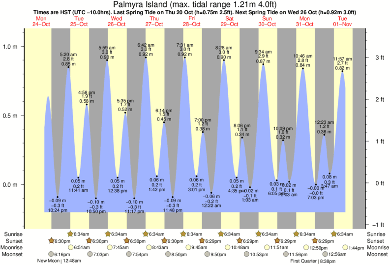 Tide Times are HST (UTC -10.0hrs). Last Spring High Tide at Palmyra Island was on Thu 04 Dec (height: 1.01m 3.3ft). Next high Spring Tide at Palmyra Island will be on Sat 20 Dec (height: 0.85m 2.8ft).