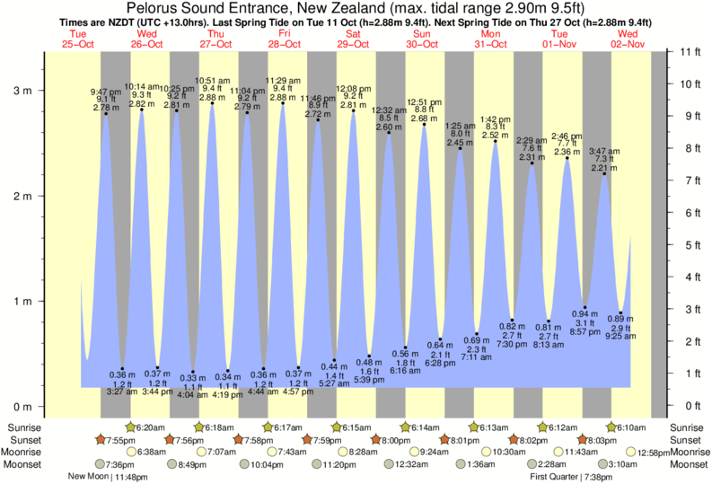 Tide chart for Pelorus Sound EntranceShowing low and high tide times for the next 30 days at Pelorus Sound Entrance. Tide Times are NZDT (UTC +13.0hrs).