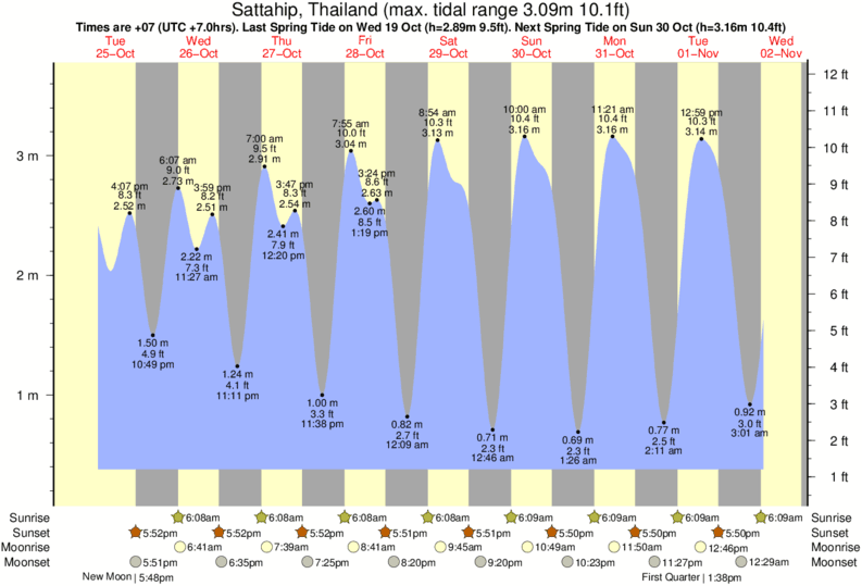 Tide Times are +07 (UTC +7.0hrs). Last Spring High Tide at Sattahip was on Sun 07 Dec (height: 3.48m 11.4ft). Next high Spring Tide at Sattahip will be on Mon 22 Dec (height: 3.24m 10.6ft).