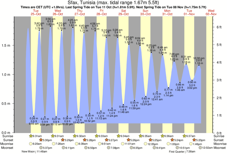 Tide Times are CET (UTC +1.0hrs). Last Spring High Tide at Sfax, Tunisia was on Fri 05 Dec (height: 1.74m 5.7ft). Next high Spring Tide at Sfax, Tunisia will be on Sun 04 Jan (height: 1.67m 5.5ft).