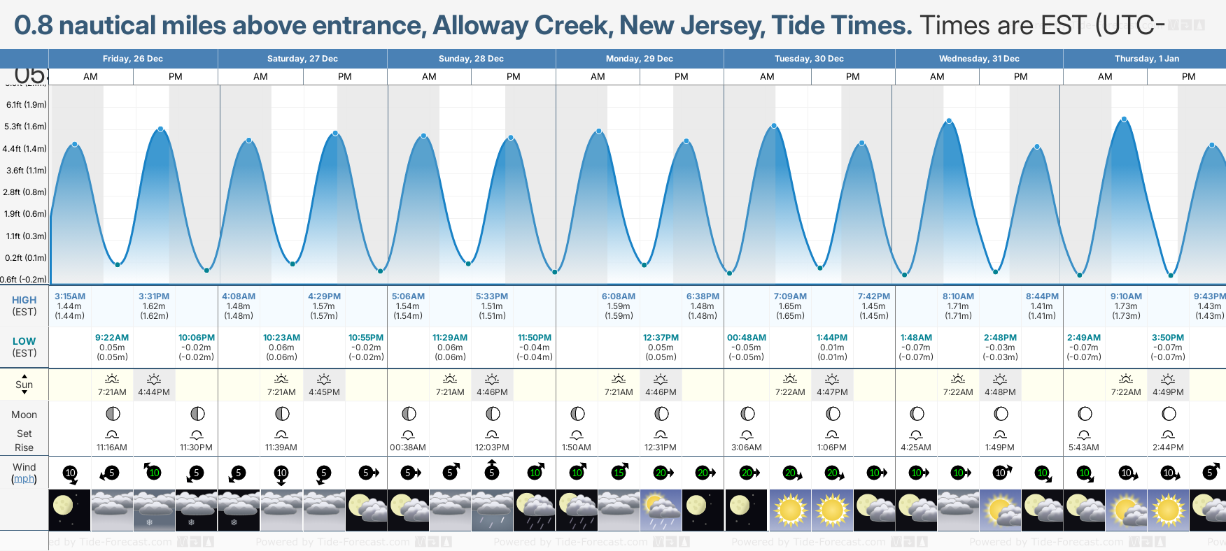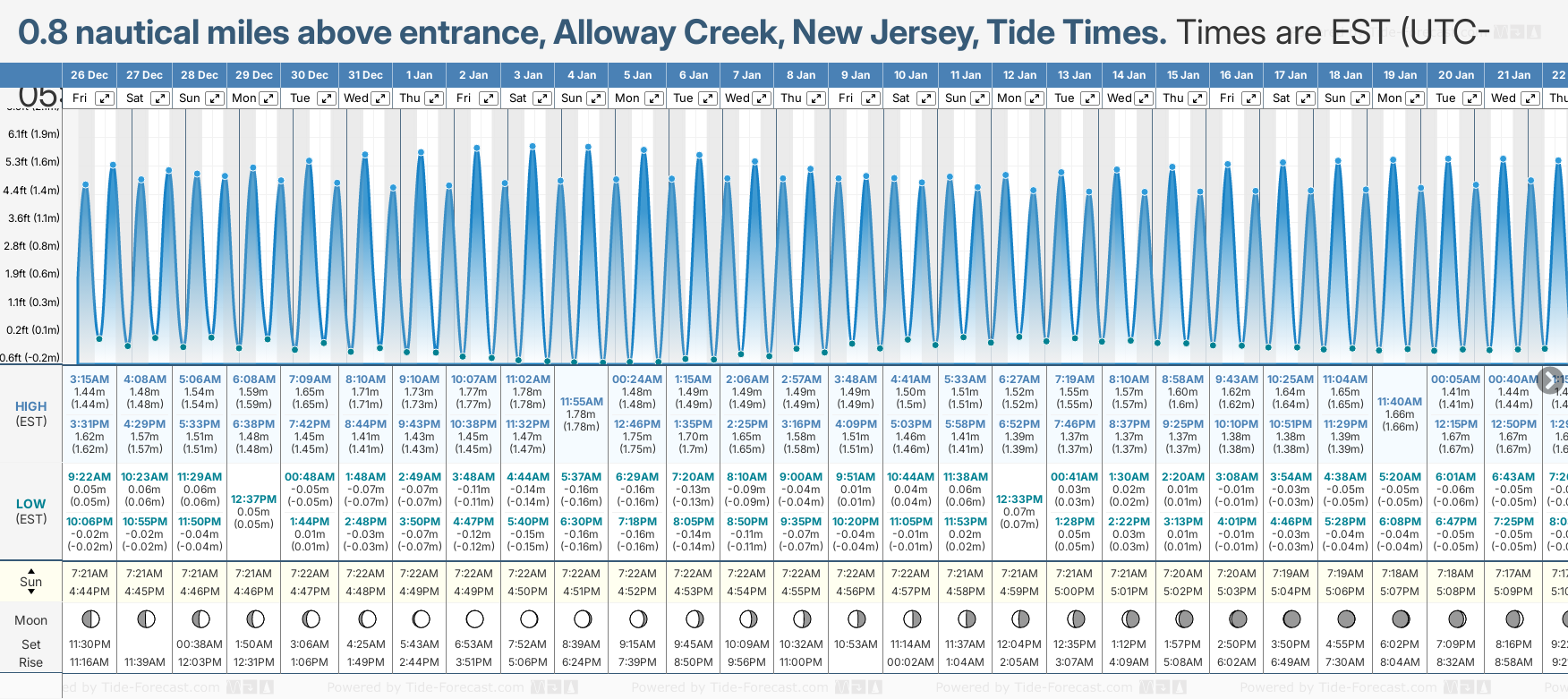 December and January Tide charts for 0.8 nautical miles above entrance, Alloway Creek: The tide charts below show the height, time and date of high and low tides for the next 30 days.