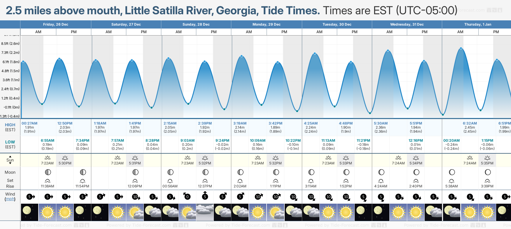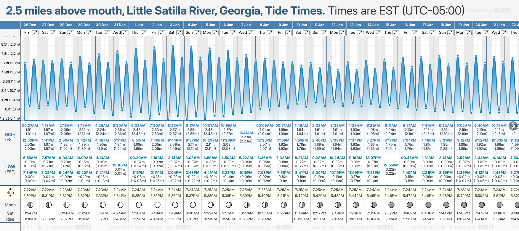 Tide chart for 2.5 miles above mouth, Little Satilla RiverShowing low and high tide times for the next 30 days at 2.5 miles above mouth, Little Satilla River. Tide Times are EST (UTC -5.0hrs).