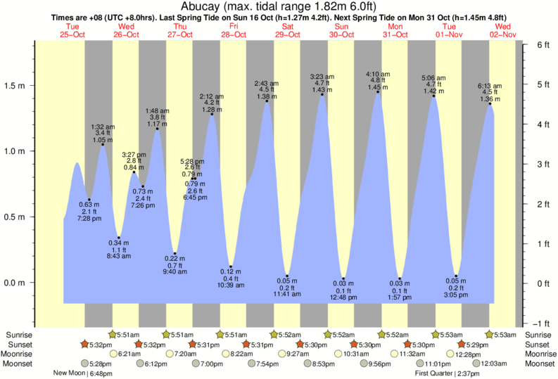 Tide Times are PST (UTC +8.0hrs). Last Spring High Tide at Abucay was on Sun 07 Dec (height: 1.66m 5.4ft). Next high Spring Tide at Abucay will be on Mon 22 Dec (height: 1.46m 4.8ft).
