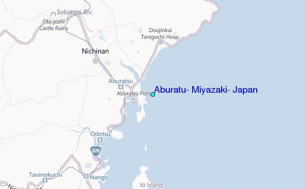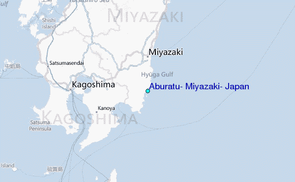 Use this relief map to navigate to tide stations, surf breaks and cities that are in the area of Aburatu, Miyazaki, Japan.