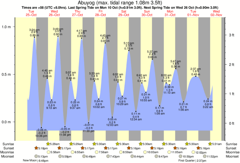 Tide Times are PST (UTC +8.0hrs). Last Spring High Tide at Abuyog was on Fri 19 Dec (height: 0.67m 2.2ft). Next high Spring Tide at Abuyog will be on Sun 28 Dec (height: 0.77m 2.5ft).