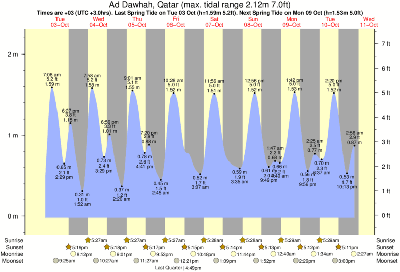 Tide chart for Ad DawhahShowing low and high tide times for the next 30 days at Ad Dawhah. Tide Times are +03 (UTC +3.0hrs).