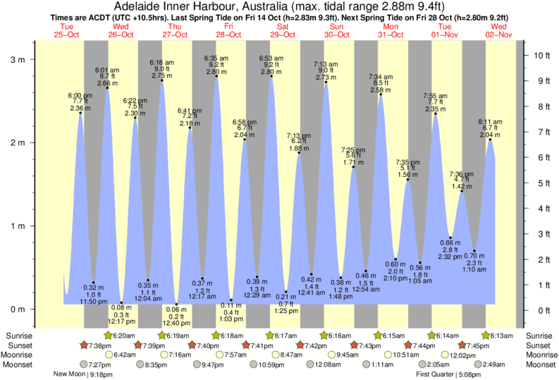Tide Times are ACDT (UTC +10.5hrs). Last Spring High Tide at Adelaide Inner Harbour was on Sat 06 Dec (height: 2.65m 8.7ft). Next high Spring Tide at Adelaide Inner Harbour will be on Sun 21 Dec (height: 2.57m 8.4ft).