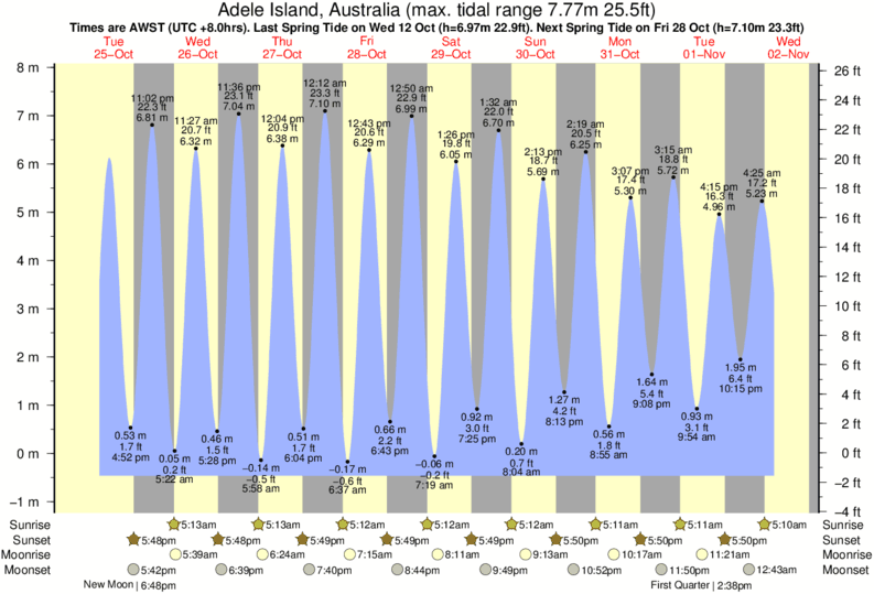 Tide Times are AWST (UTC +8.0hrs). Last Spring High Tide at Adele Island was on Sat 06 Dec (height: 7.27m 23.9ft). Next high Spring Tide at Adele Island will be on Mon 22 Dec (height: 6.26m 20.5ft).