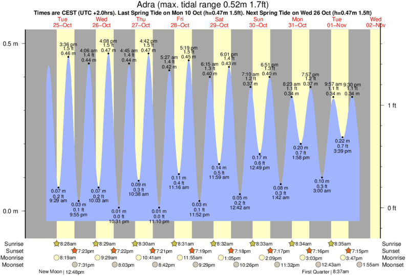 Tide Times are CET (UTC +1.0hrs). Last Spring High Tide at Adra was on Sat 06 Dec (height: 0.48m 1.6ft). Next high Spring Tide at Adra will be on Sun 21 Dec (height: 0.43m 1.4ft).