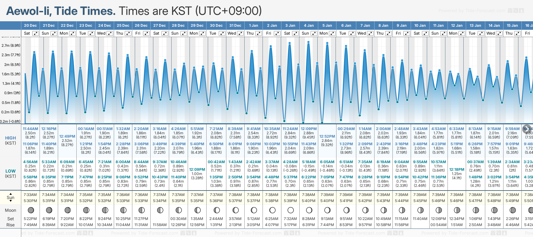 December and January Tide charts for Aewol-li: The tide charts below show the height, time and date of high and low tides for the next 30 days.
