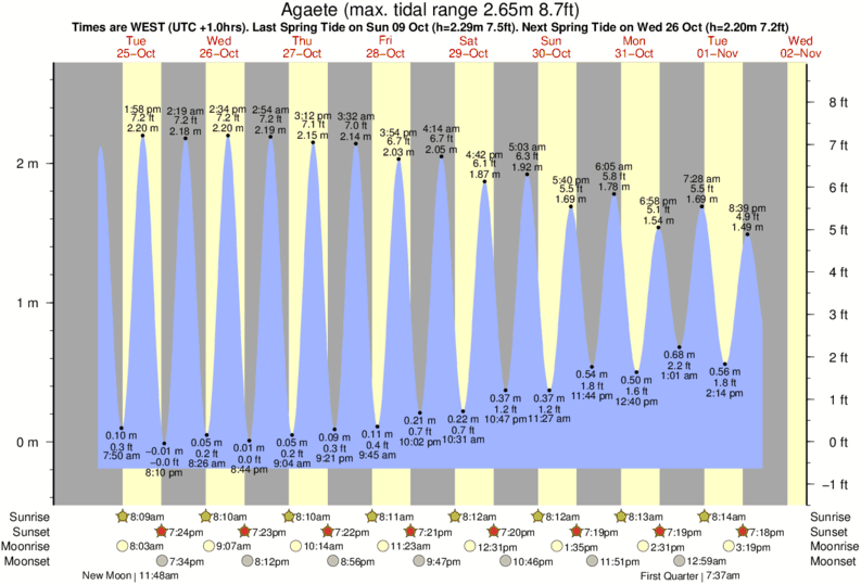 Tide Times are WET (UTC +0hrs). Last Spring High Tide at Agaete was on Sat 06 Dec (height: 2.26m 7.4ft). Next high Spring Tide at Agaete will be on Mon 22 Dec (height: 2.01m 6.6ft).