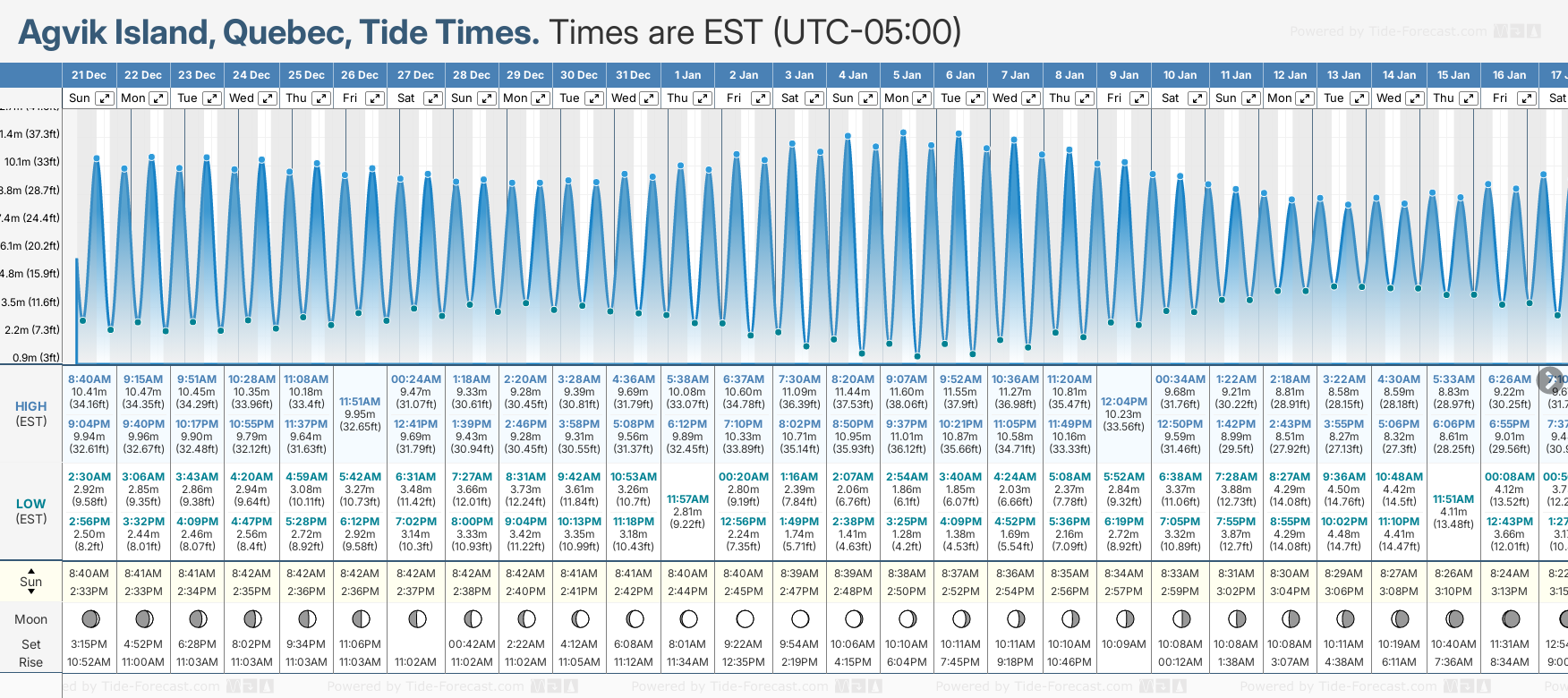 December and January Tide charts for Agvik Island: The tide charts below show the height, time and date of high and low tides for the next 30 days.