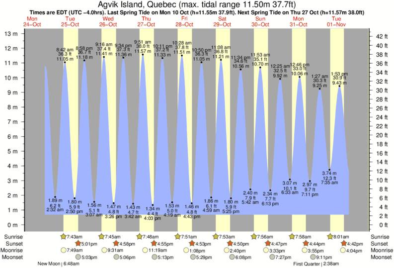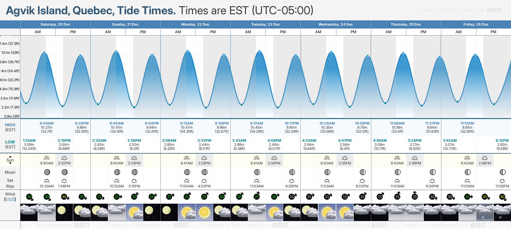 Tide Times are EST (UTC -5.0hrs). Last Spring High Tide at Agvik Island was on Sat 06 Dec (height: 11.72m 38.5ft). Next high Spring Tide at Agvik Island will be on Mon 22 Dec (height: 10.47m 34.4ft).