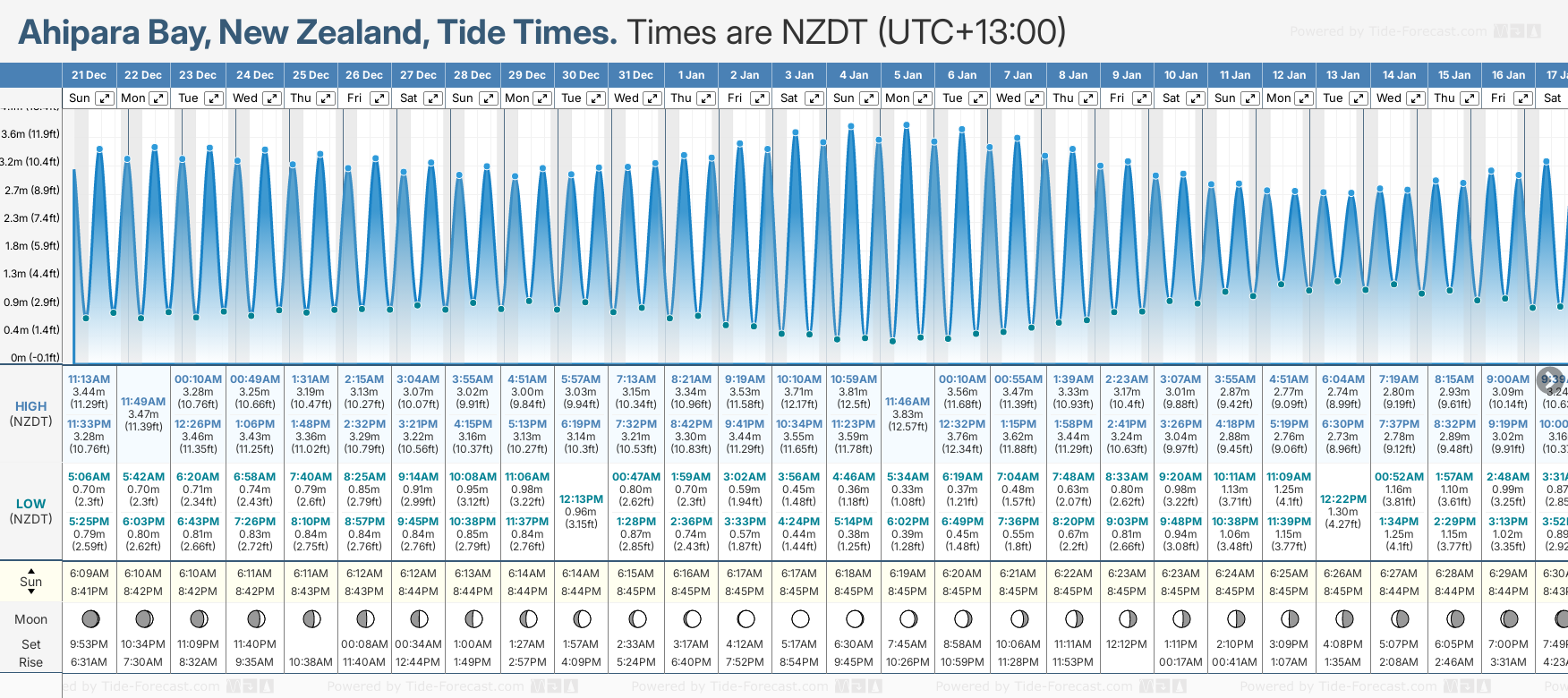 December and January Tide charts for Ahipara Bay: The tide charts below show the height, time and date of high and low tides for the next 30 days.