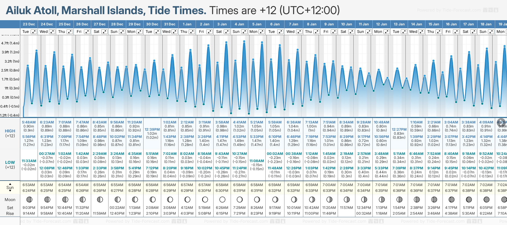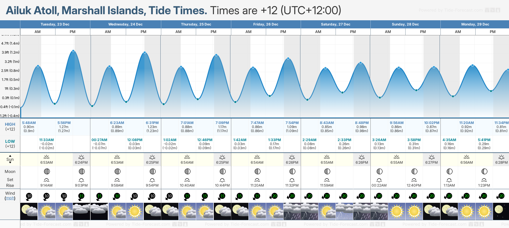 December and January Tide charts for Ailuk: The tide charts below show the height, time and date of high and low tides for the next 30 days.