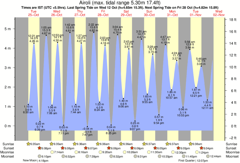 Tide Times are IST (UTC +5.5hrs). Last Spring High Tide at Airoli was on Sat 06 Dec (height: 5.01m 16.4ft). Next high Spring Tide at Airoli will be on Mon 22 Dec (height: 4.42m 14.5ft).