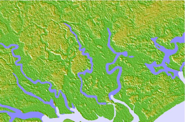 Use this relief map to navigate to tide stations, surf breaks and cities that are in the area of Airy Hall Plantation, Ashepoo River, South Carolina.