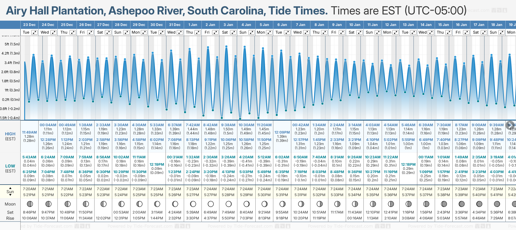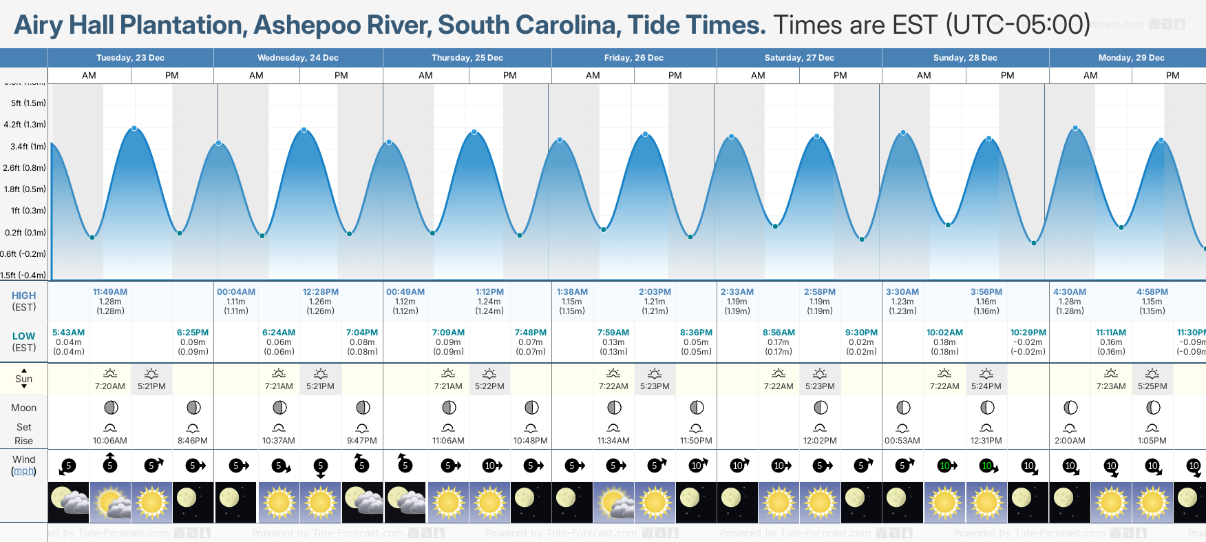 December and January Tide charts for Airy Hall Plantation, Ashepoo River: The tide charts below show the height, time and date of high and low tides for the next 30 days.