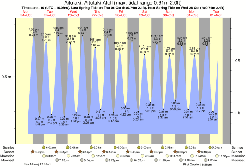 Aitutaki, Aitutaki Atoll tide chart key: The tide chart above shows the height and times of high tide and low tide for Aitutaki, Aitutaki Atoll. The grey shading corresponds to nighttime hours between sunset and sunrise at Aitutaki, Aitutaki Atoll.