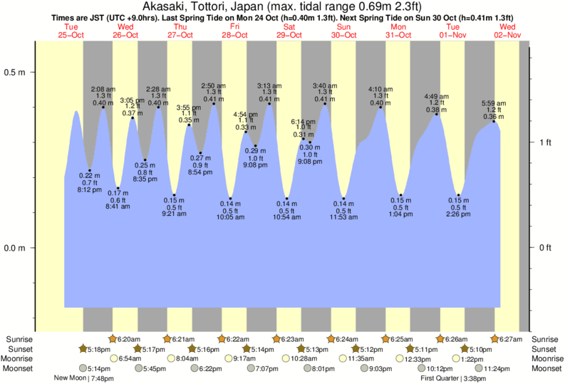 Akasaki tide chart key: The tide chart above shows the height and times of high tide and low tide for Akasaki, Tottori, Japan. The grey shading corresponds to nighttime hours between sunset and sunrise at Akasaki.