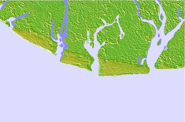 Use this relief map to navigate to tide stations, surf breaks and cities that are in the area of Akassa, Nigeria.