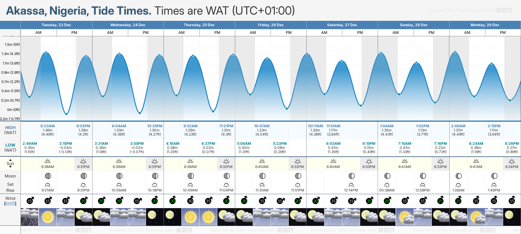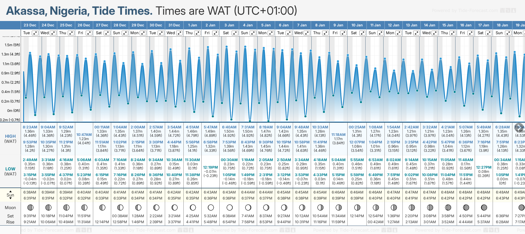 December and January Tide charts for Akassa: The tide charts below show the height, time and date of high and low tides for the next 30 days.