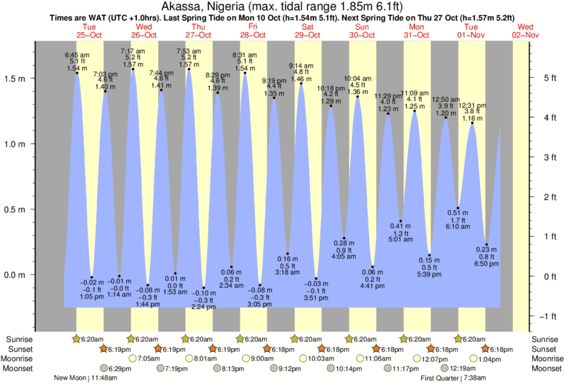 Tide Times are WAT (UTC +1.0hrs). Last Spring High Tide at Akassa was on Sun 21 Dec (height: 1.38m 4.5ft). Next high Spring Tide at Akassa will be on Sat 03 Jan (height: 1.50m 4.9ft).