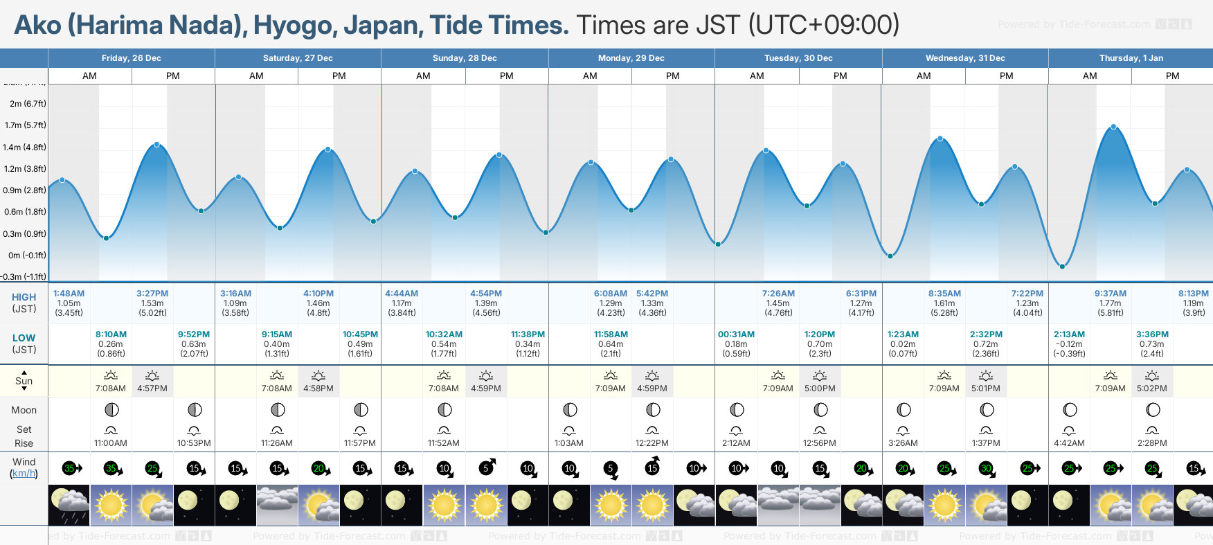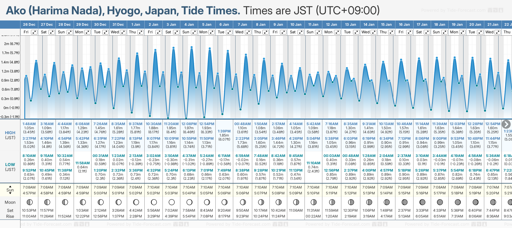 Tide Times are JST (UTC +9.0hrs). Last Spring High Tide at Ako (Harima Nada) was on Sun 21 Dec (height: 1.70m 5.6ft). Next high Spring Tide at Ako (Harima Nada) will be on Sun 04 Jan (height: 1.97m 6.5ft).
