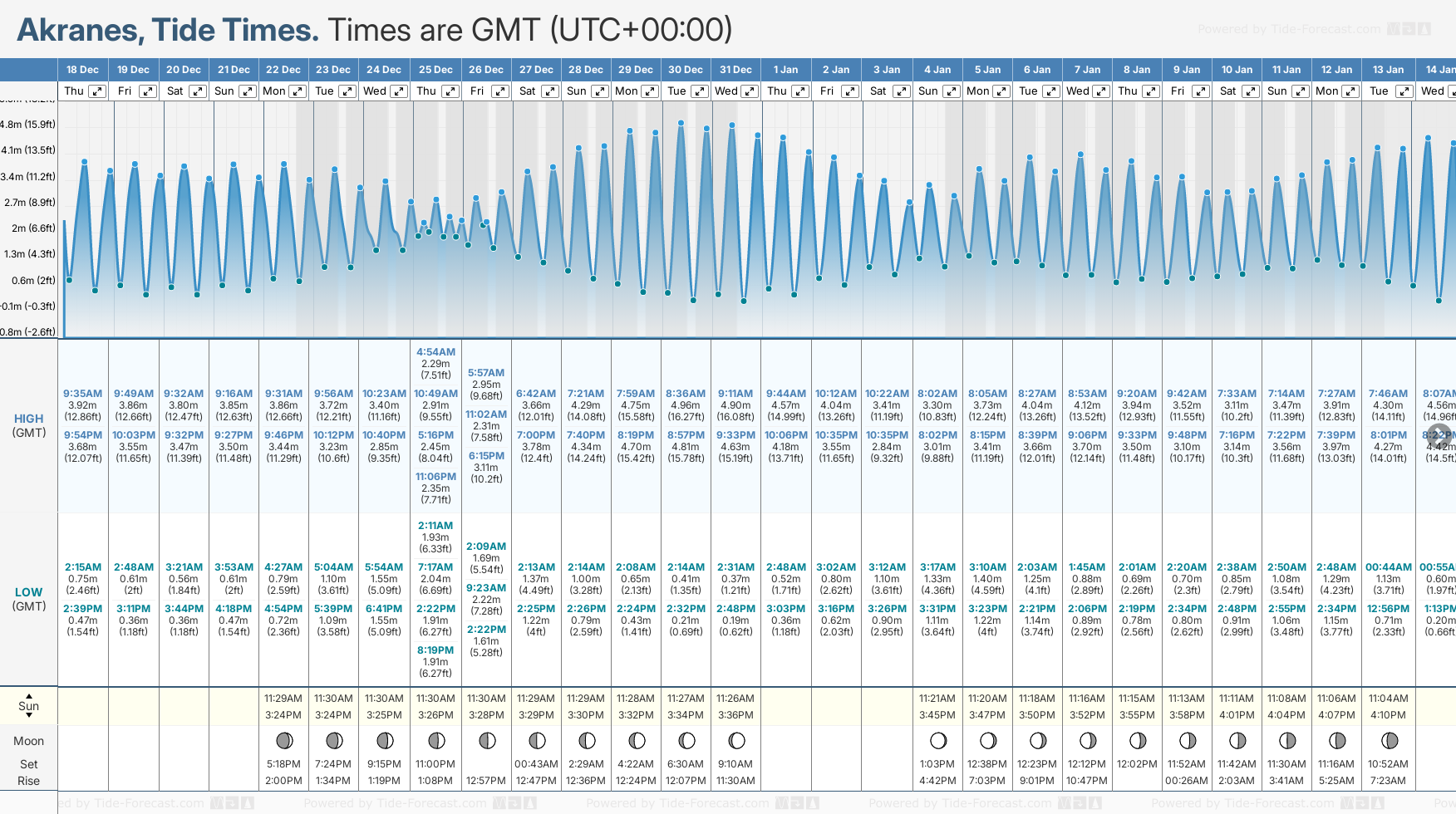 December and January Tide charts for Akranes: The tide charts below show the height, time and date of high and low tides for the next 30 days.