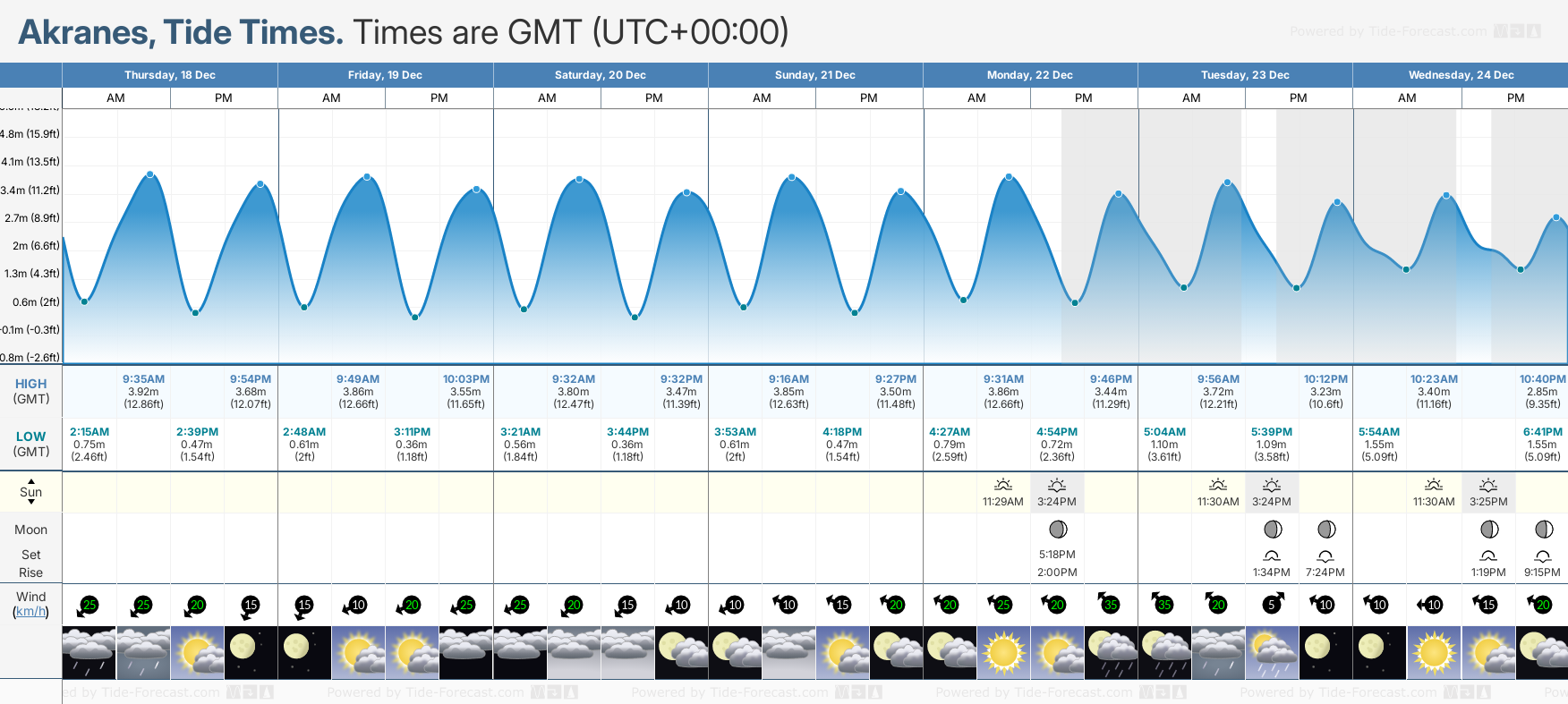 Tide Times are GMT (UTC +0hrs). Last Spring High Tide at Akranes was on Wed 10 Dec (height: 3.48m 11.4ft). Next high Spring Tide at Akranes will be on Mon 22 Dec (height: 3.86m 12.7ft).