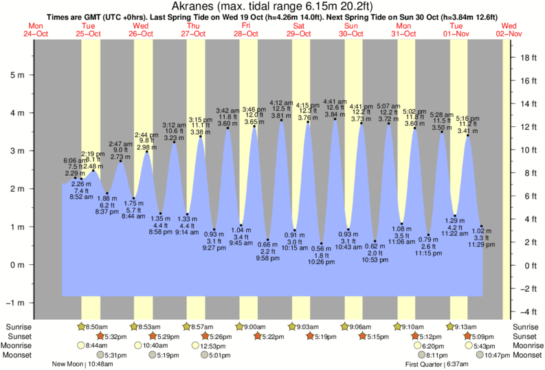 Tide Times are GMT (UTC +0hrs). Last Spring High Tide at Akranes was on Thu 18 Dec (height: 3.92m 12.9ft). Next high Spring Tide at Akranes will be on Tue 30 Dec (height: 4.96m 16.3ft).