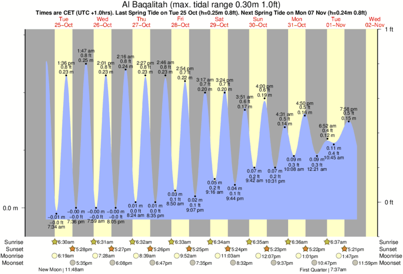 Tide Times are CET (UTC +1.0hrs). Last Spring High Tide at Al Baqalitah was on Sun 07 Dec (height: 0.23m 0.8ft). Next high Spring Tide at Al Baqalitah will be on Mon 22 Dec (height: 0.23m 0.8ft).
