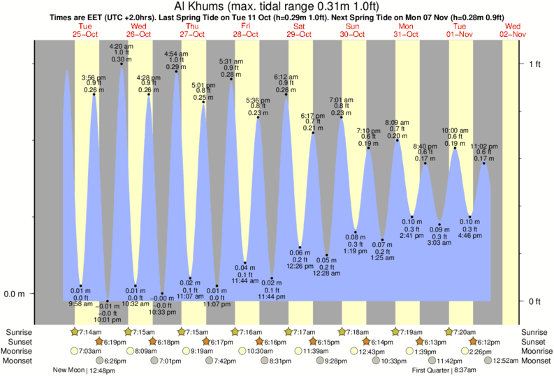 Tide Times are EET (UTC +2.0hrs). Last Spring High Tide at Al Khums was on Sun 21 Dec (height: 0.26m 0.9ft). Next high Spring Tide at Al Khums will be on Sat 03 Jan (height: 0.28m 0.9ft).