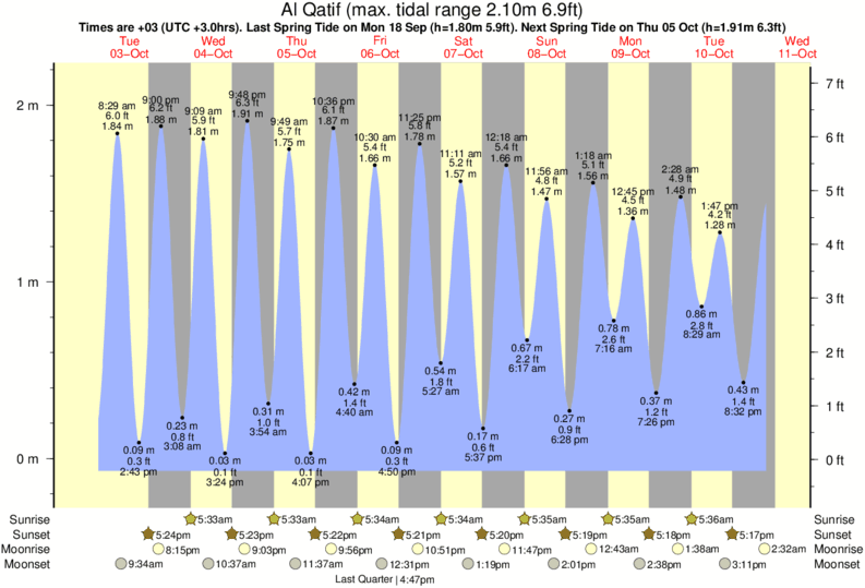 Tide Times are +03 (UTC +3.0hrs). Last Spring High Tide at Al Qatif was on Wed 10 Dec (height: 2.03m 6.7ft). Next high Spring Tide at Al Qatif will be on Wed 24 Dec (height: 1.86m 6.1ft).