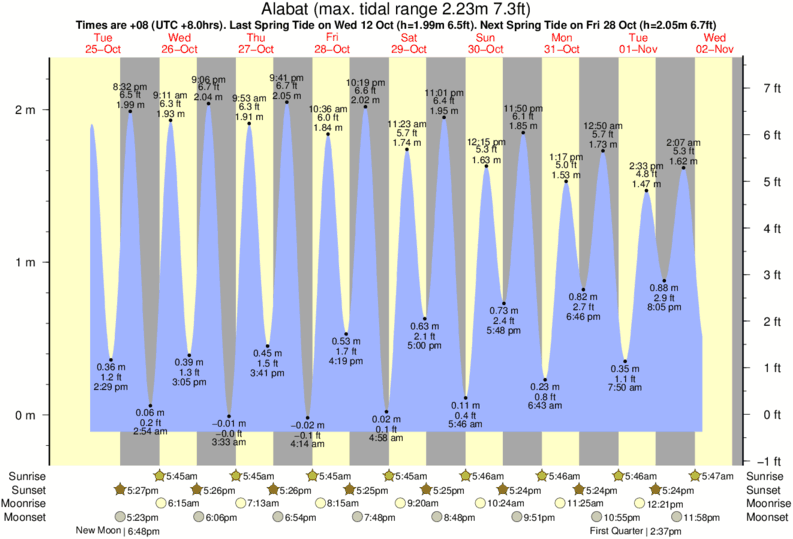 Tide Times are PST (UTC +8.0hrs). Last Spring High Tide at Alabat was on Sat 06 Dec (height: 2.13m 7.0ft). Next high Spring Tide at Alabat will be on Tue 23 Dec (height: 1.94m 6.4ft).
