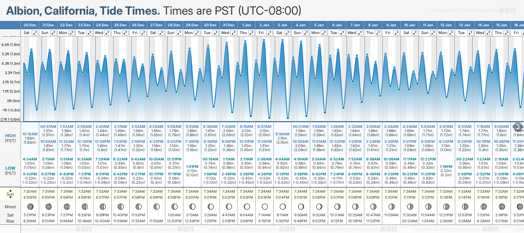 Tide Times are PST (UTC -8.0hrs). Last Spring High Tide at Albion was on Fri 19 Dec (height: 1.83m 6.0ft). Next high Spring Tide at Albion will be on Fri 02 Jan (height: 2.15m 7.1ft).