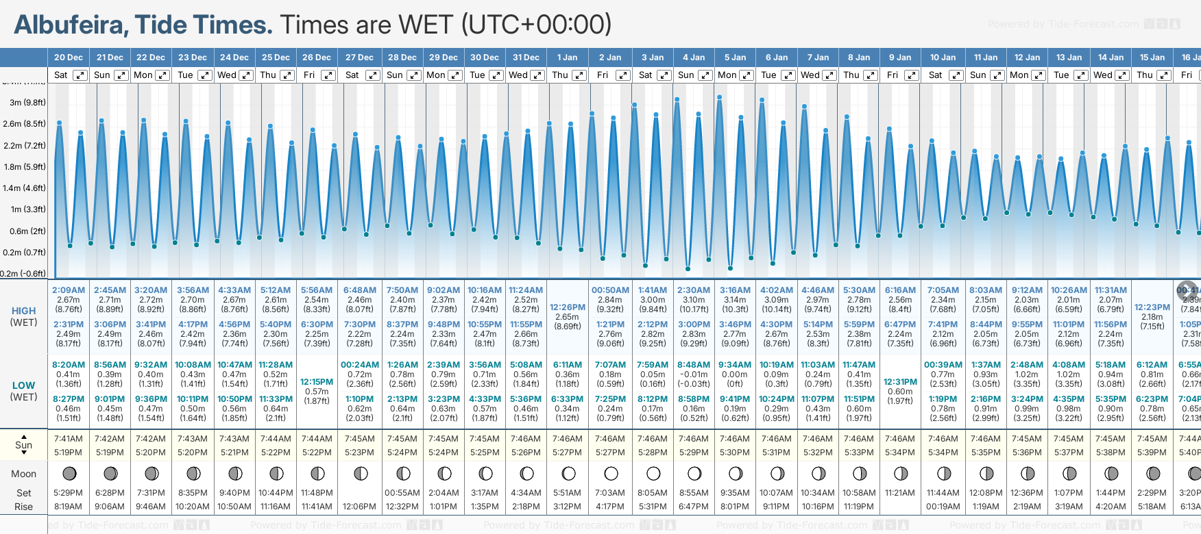 Tide Times are WET (UTC +0hrs). Last Spring High Tide at Albufeira was on Sat 06 Dec (height: 3.11m 10.2ft). Next high Spring Tide at Albufeira will be on Mon 22 Dec (height: 2.72m 8.9ft).