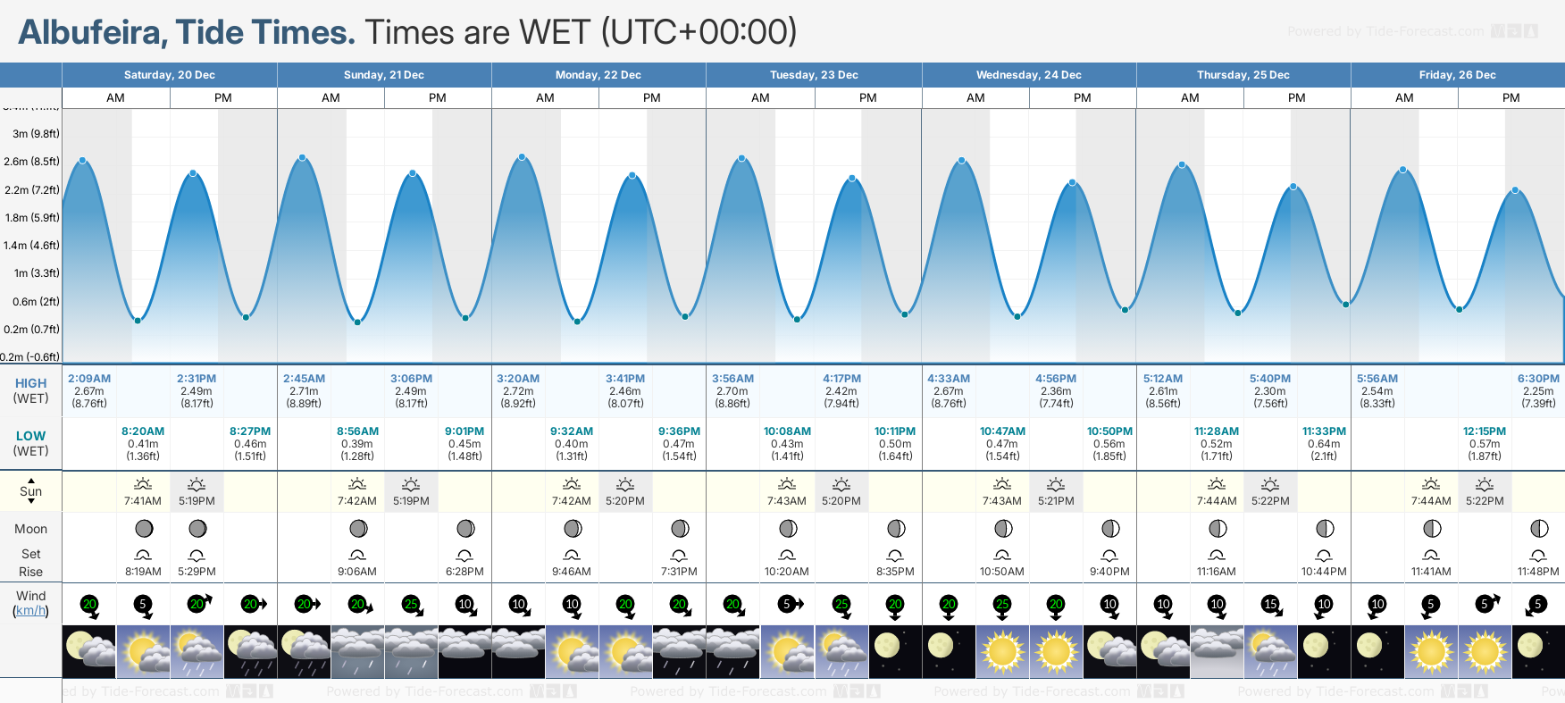 Tide chart for AlbufeiraShowing low and high tide times for the next 30 days at Albufeira. Tide Times are WET (UTC +0hrs).