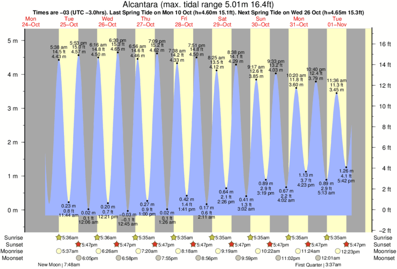 Tide Times are -03 (UTC -3.0hrs). Last Spring High Tide at Alcantara was on Fri 05 Dec (height: 4.77m 15.6ft). Next high Spring Tide at Alcantara will be on Sat 20 Dec (height: 4.16m 13.6ft).