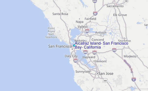 Use this relief map to navigate to tide stations, surf breaks and cities that are in the area of Alcatraz Island, San Francisco Bay, California.