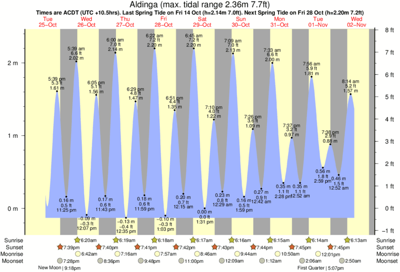 Aldinga tide chart key: The tide chart above shows the height and times of high tide and low tide for Aldinga. The grey shading corresponds to nighttime hours between sunset and sunrise at Aldinga.