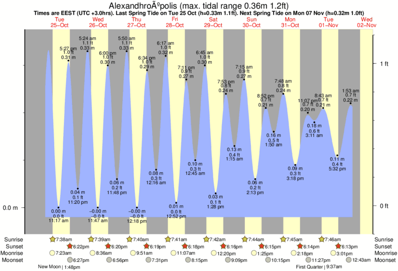 Tide Times are EET (UTC +2.0hrs). Last Spring High Tide at Alexandhroúpolis was on Sat 20 Dec (height: 0.30m 1.0ft). Next high Spring Tide at Alexandhroúpolis will be on Sat 03 Jan (height: 0.31m 1.0ft).