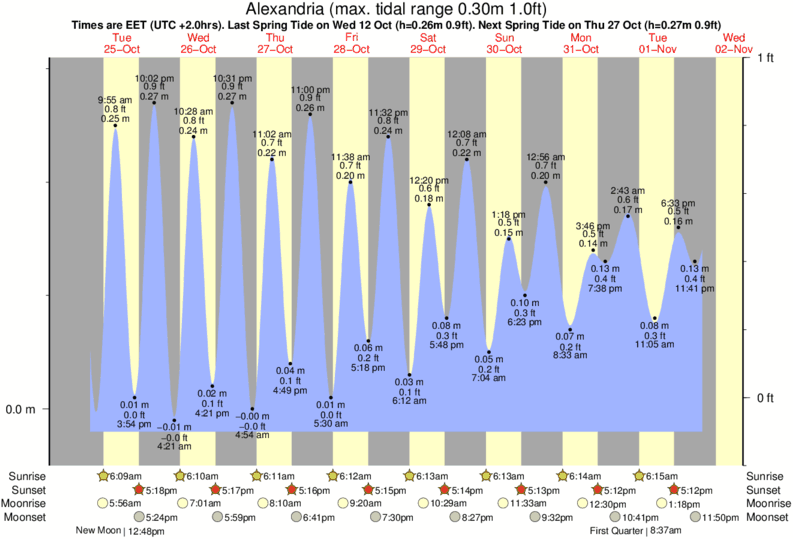 Tide Times are EET (UTC +2.0hrs). Last Spring High Tide at Alexandria was on Fri 19 Dec (height: 0.25m 0.8ft). Next high Spring Tide at Alexandria will be on Sun 04 Jan (height: 0.27m 0.9ft).