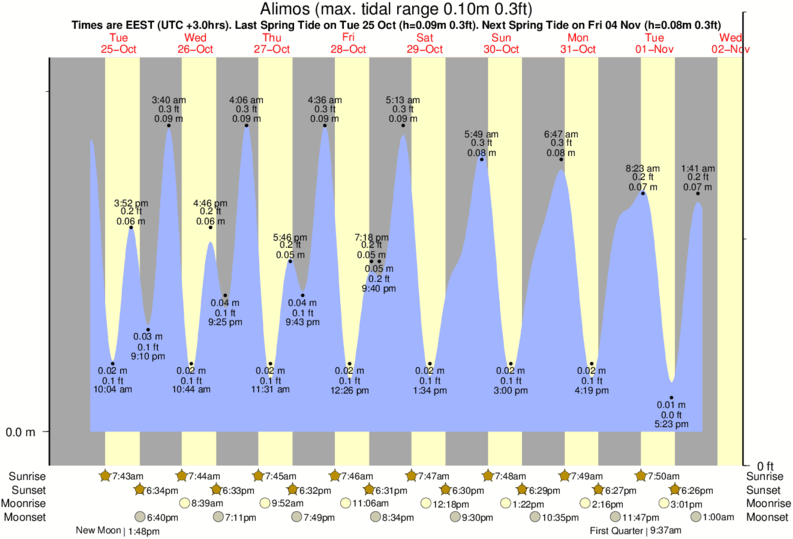 Tide Times are EET (UTC +2.0hrs). Last Spring High Tide at Alimos was on Fri 19 Dec (height: 0.09m 0.3ft). Next high Spring Tide at Alimos will be on Wed 31 Dec (height: 0.10m 0.3ft).